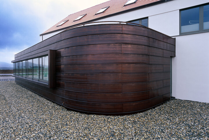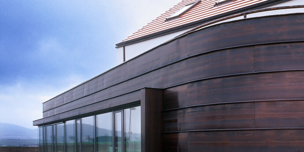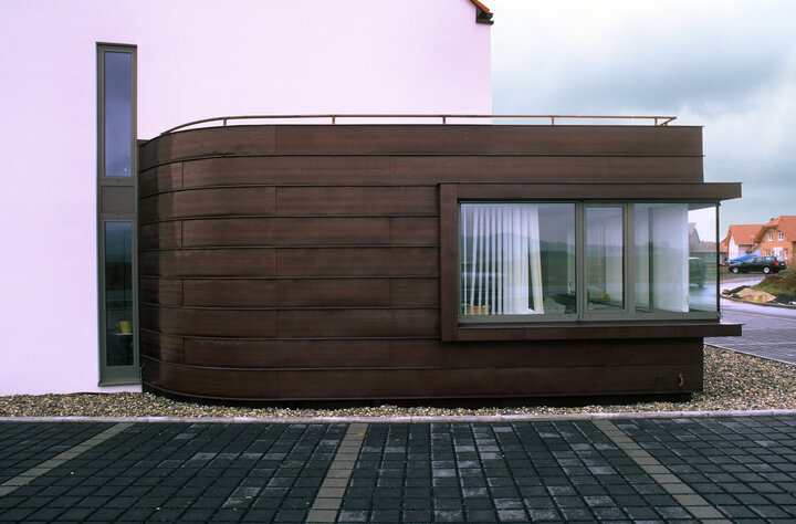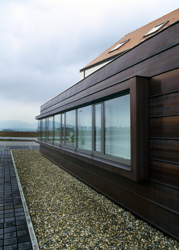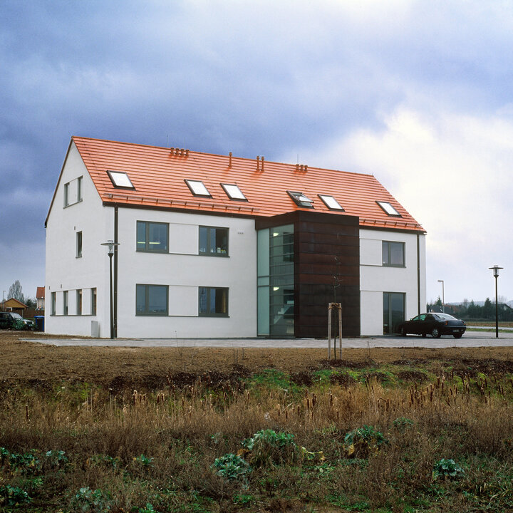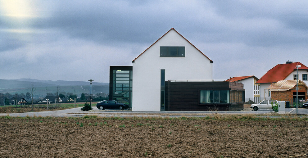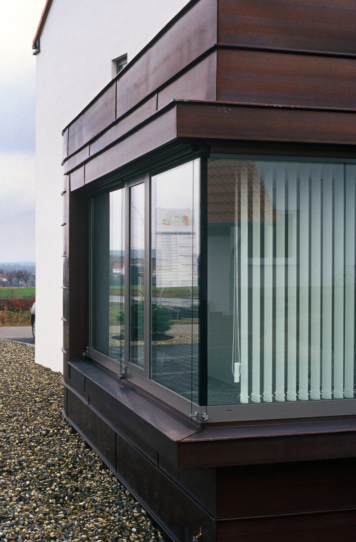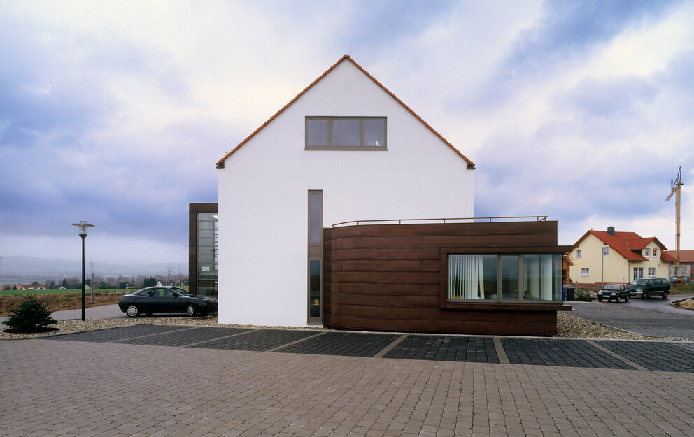 Ein Haus für Ärzte in der strategischen Lage zwischen zwei Ortschaften im Übergang zur kurhessischen Landschaft. Aus den stringenten Vorgaben des Planungsrechtes wird das Essentielle destilliert ein archetypisches Haus umkleidet mit Putz und Ziegel, dem als Kern Elemente aus Glas und Kupfer wie Außenmöbel hinzugefügt werden. Einfügung und Individualität durch fluchten und drehen, Bezug nehmen und pointieren sind das Thema dieses Ensembles.