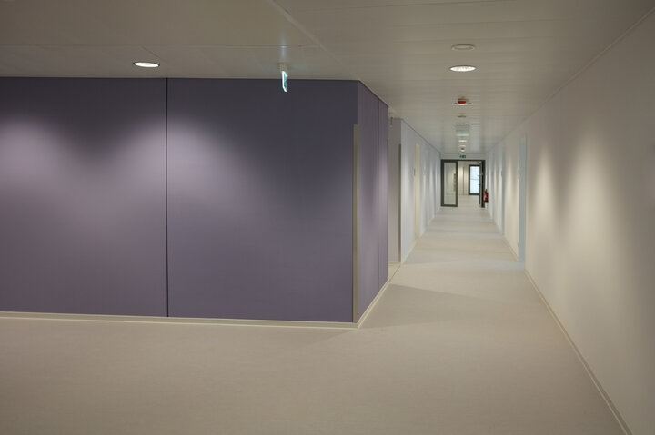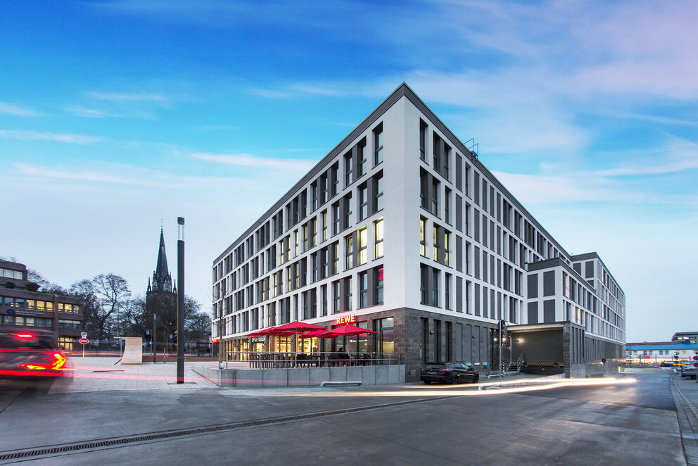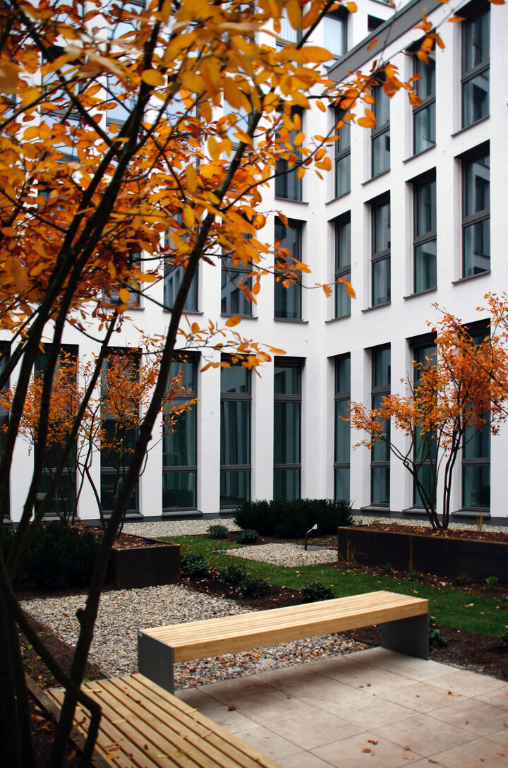 Zwei Innenhöfe mit gestalteten Freiflächen erhöhen die Belichtungs- und Aufenthaltsqualitäten für die Büronutzer. In einem speziell für die Innenräume entwickelten Farbkonzept werden die urbanen Referenzmaterialien des Standortes weiterentwickelt und das gesamte Innere atmosphärisch aufgeladen. Jede Etage wird durch eine Leitfarbe charakterisiert, aus der sich das Spektrum für die differenzierte Gestaltung der Farbträgerflächen Wand und Boden in allen Räumen ableitet.