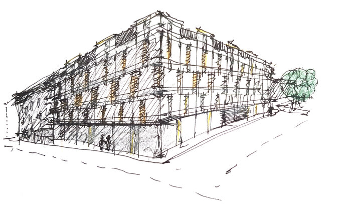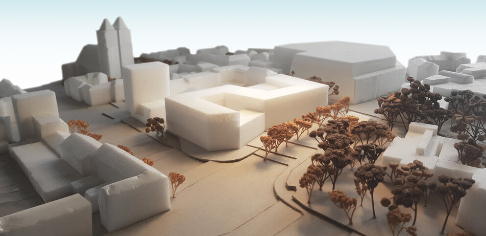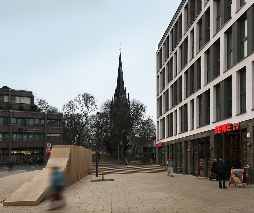 Nach Stilllegung des Stadtbades Mitte konnte ausgehend von unserer Machbarkeitsstudie ein für den innerstädtischen Raum bedeutender Stadtbaukörper neu entwickelt werden. Bei der plastischen Ausformung der Baufigur auf dem Boden des mittelalterlichen Festungsgrabens wurden historische Fluchtlinien als Faltungen in der Fassade sichtbar gemacht und die gut proportionierte Geschossigkeit der zerstörten Vorkriegsbebauung am Lutherplatz als Maßstab übernommen und weiterentwickelt.