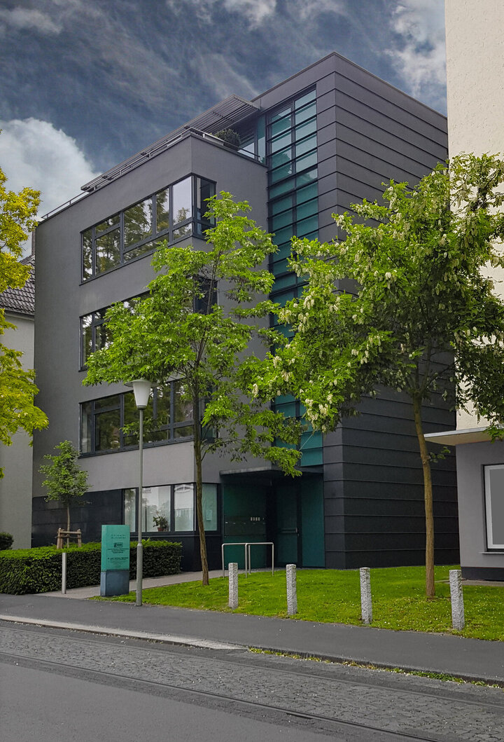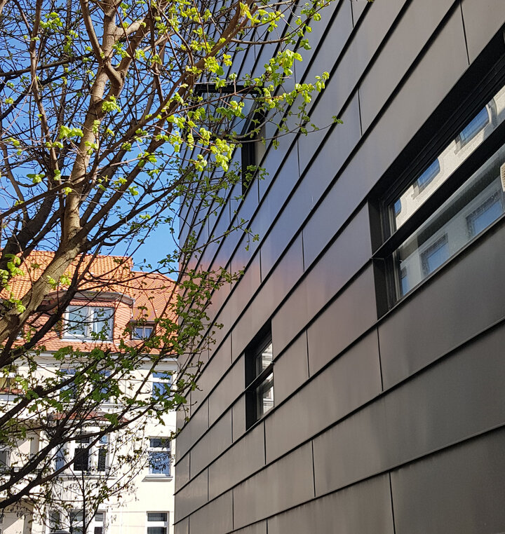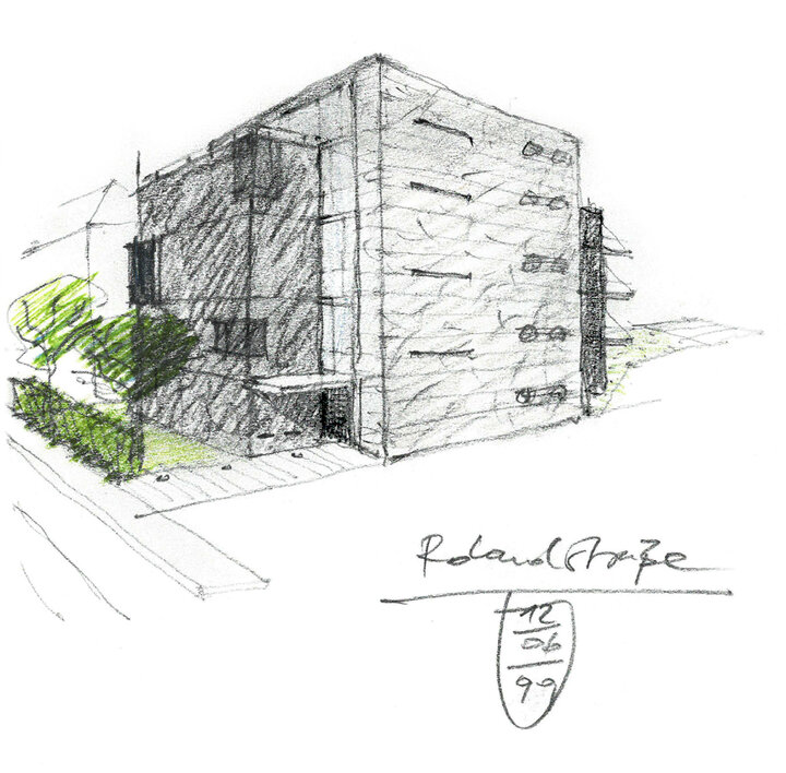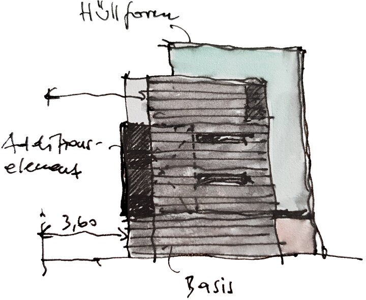 Das Gebäude ist als präzise zugeschnittener Baukörper geplant. Durch die monochrome Behandlung der unterschiedlichen Oberflächen und Texturen als blackbox entsteht eine Gebäudefigur mit einem hohen Maß an geschlossener Wirkung als urbaner Körper in dieser von so unterschiedlichen Kraftfeldern beherrschten Baulücke.