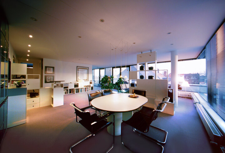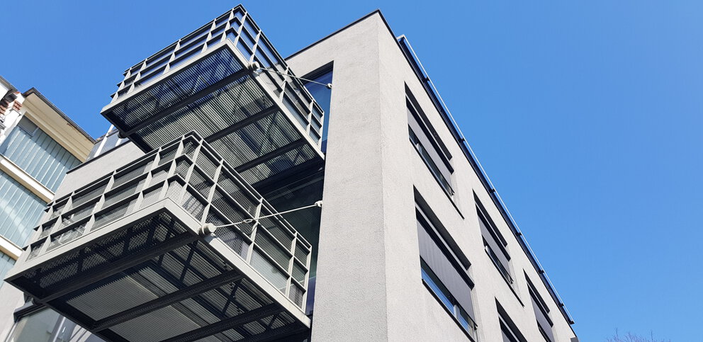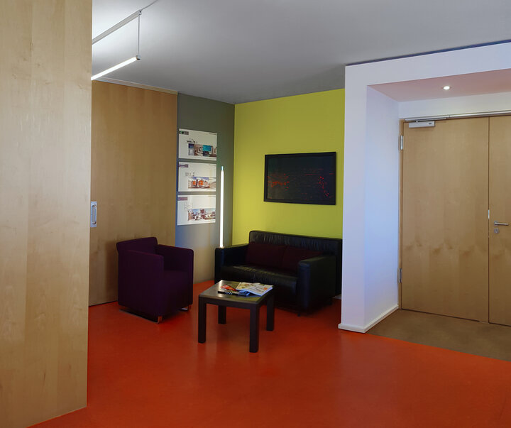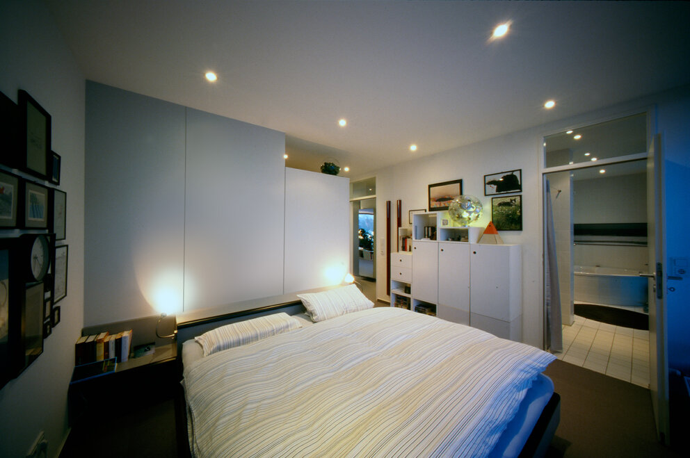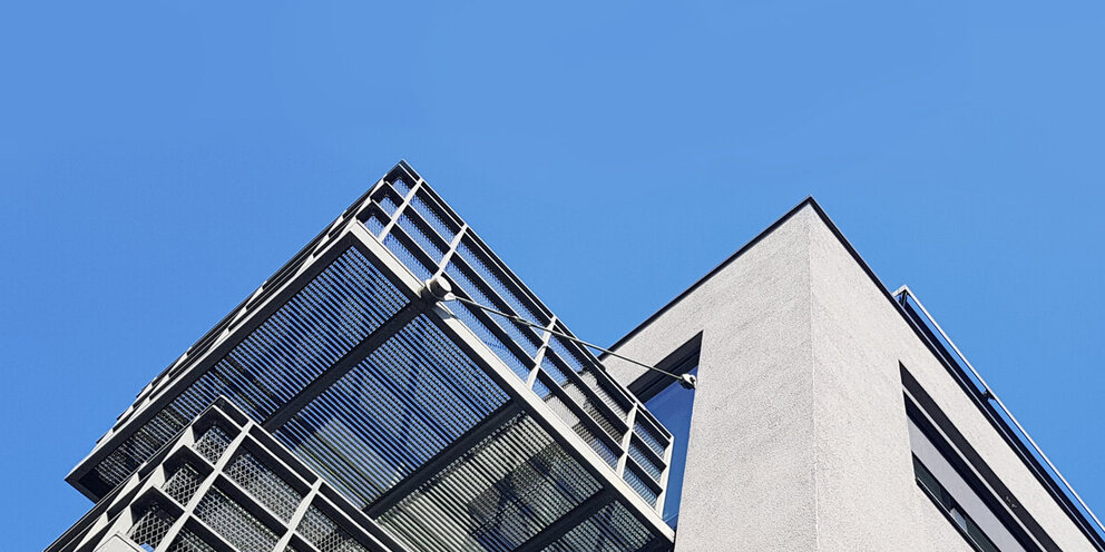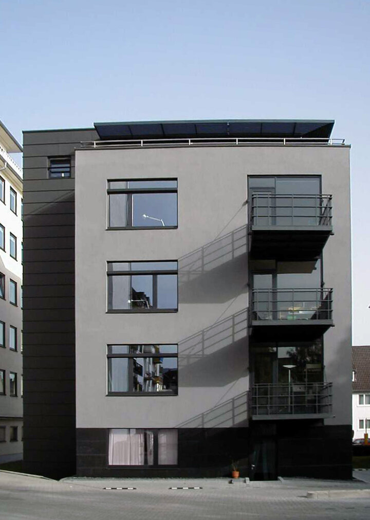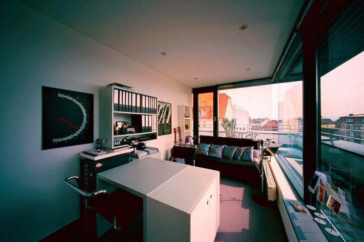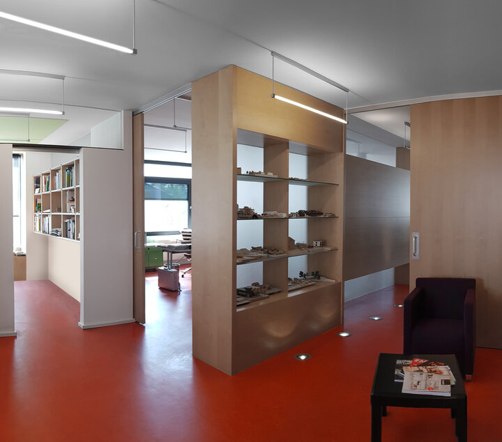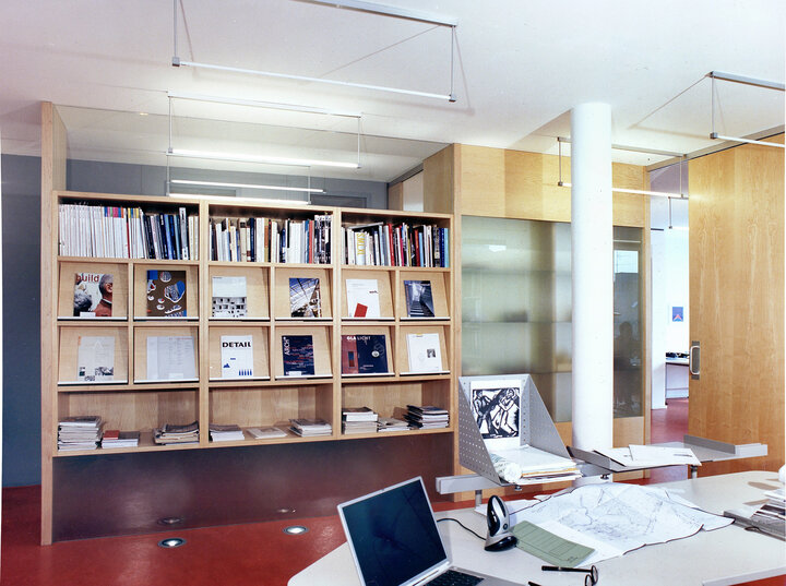 Die Flächen der Körper sowie die Formate der Fenster und ihr Teilungsmodus sind nach den Regeln des Goldenen Schnittes entwickelt. Im Innern wird die Baukörpergliederung konsequent in dienende und bediente Flächen übersetzt. Die Erschliessungs- und Versorgungssysteme sind gebündelt und die Büronutzflächen entwickeln sich flexibel in offenen loftartigen Etagen.