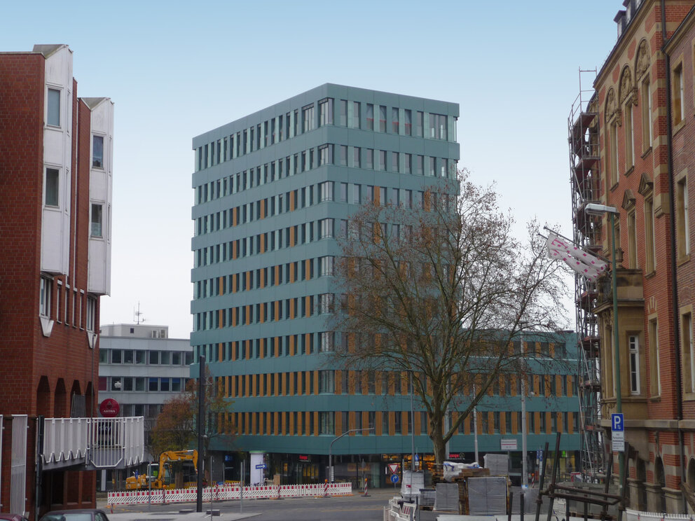 Auf dem Eckgrundstück wurde 1970 ein 8-geschössiges Bürogebäude erstelllt.Die fussläufige Haupterschliessung erfolgt über die Karthäuserstrasse, die topographisch gegenüber der Friedrich-Ebert-Straße abfällt. Die Zufahrt zu den 2 Tiefgaragenebenen in den Untergeschossen erfolgt über die Strasse Hinter dem Kommödchen. Über einen Erdgeschoss, welches Ladenflächen beinhaltet, entwickelt sich das Gebäude im Bestand mit 2. Obergeschossen von knapp 950m2 BGF und verkleinert sich in den Etagen 3-8 auf ca. 430m2 BGF zu einem kompakten Turm. Ergänzt wird das Volumen durch ein Staffelgeschoss im 3. OG entlang der Friedrich-Ebert-Straße welches zu den Nachbarbauten vermittelt sowie durch einen Dachaufbau auf dem Turm, der Wartungsgerät und Technische Anlagen beinhaltet.