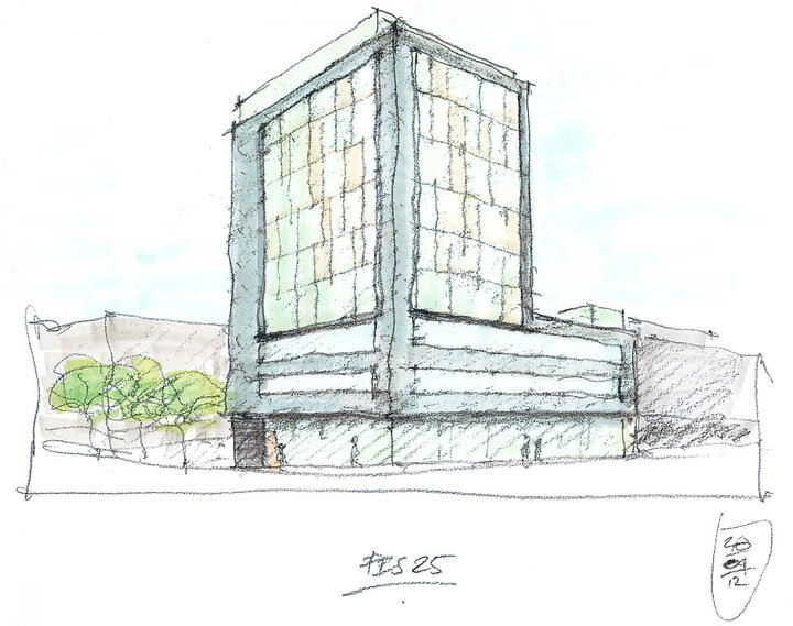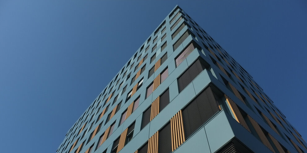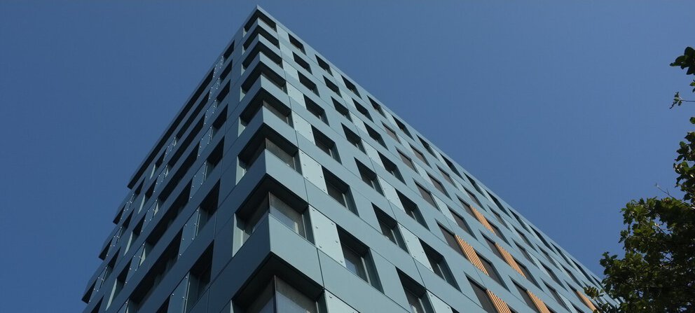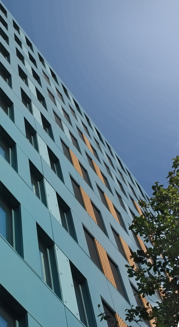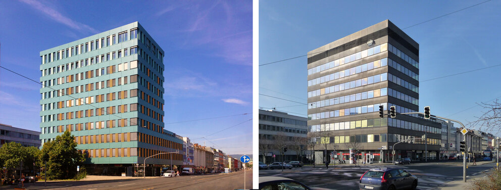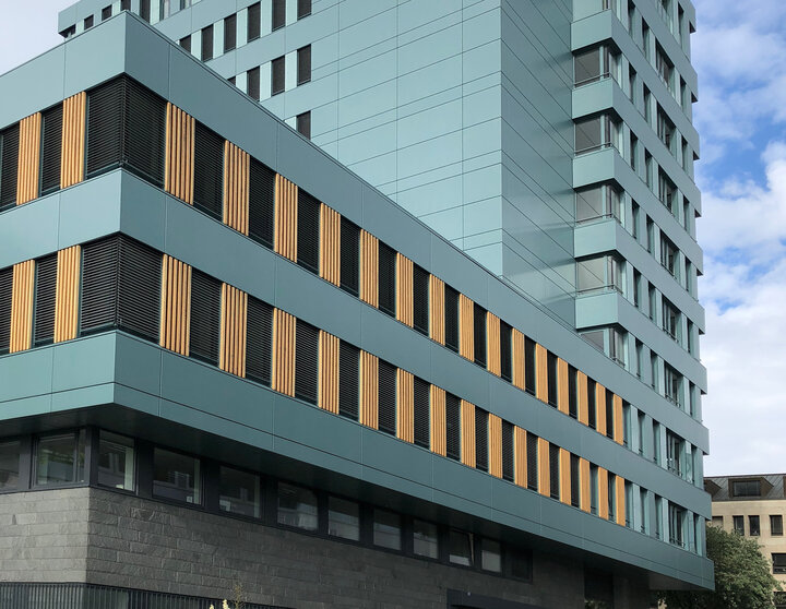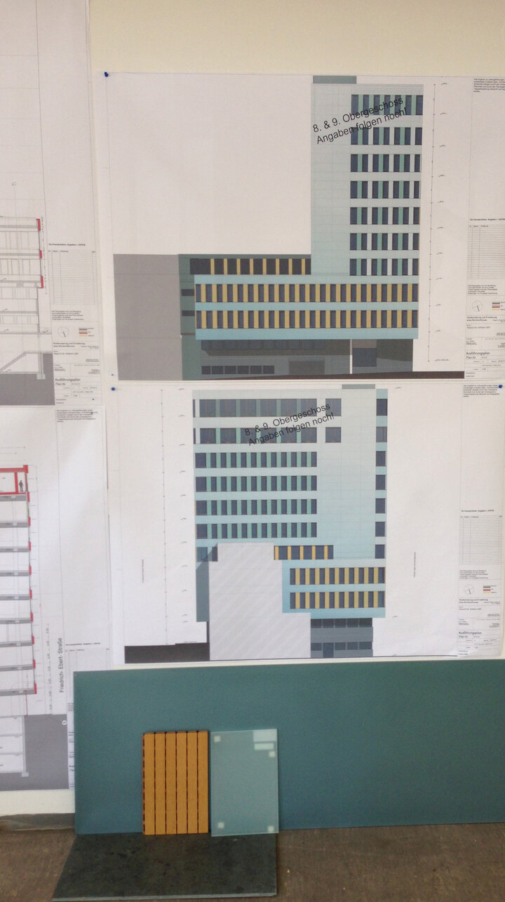Die Bekleidung des bestehenden Baukörpers erfolgte mit flächigen Metall- und Glastafeln in Bronzefarbe in horizontaler Bänderung. Die Fassade wird komplett abgenommen.Die neuen Fenster werden als Einzelelemente mit beweglichen Dreh-Kipp-Fenstern in brandschutzgekapselte, hochgedämmte Holzwandelemente gesetzt. Die Stb-Brüstungen werden teilweise etwas zurückgenommen, die Absturzsicherung über aussenliegende Glasbrüstungen sichergestellt. An der Süd-, Ost- und Westfassade kommt ein aussenliegender Sonnenschutz zur Ausführung. Die Geschlossenen Wandbereiche erhalten eine Blechbekleidung auf Metall-Unterkonstruktion über Wärmedämmung aus Mineralfaser. Zwischen den Fenstern kommen in Variationen Blechbekleidungen, Glaspaneele oder Eichenholz-Lamellenelemente zur Anwendung.
