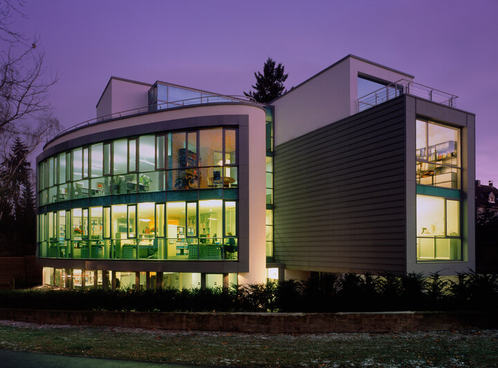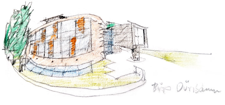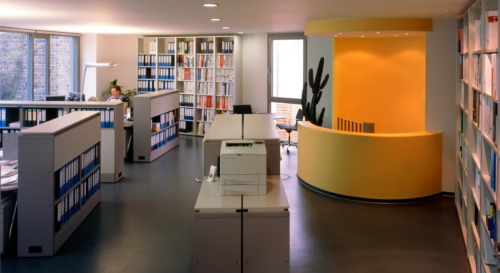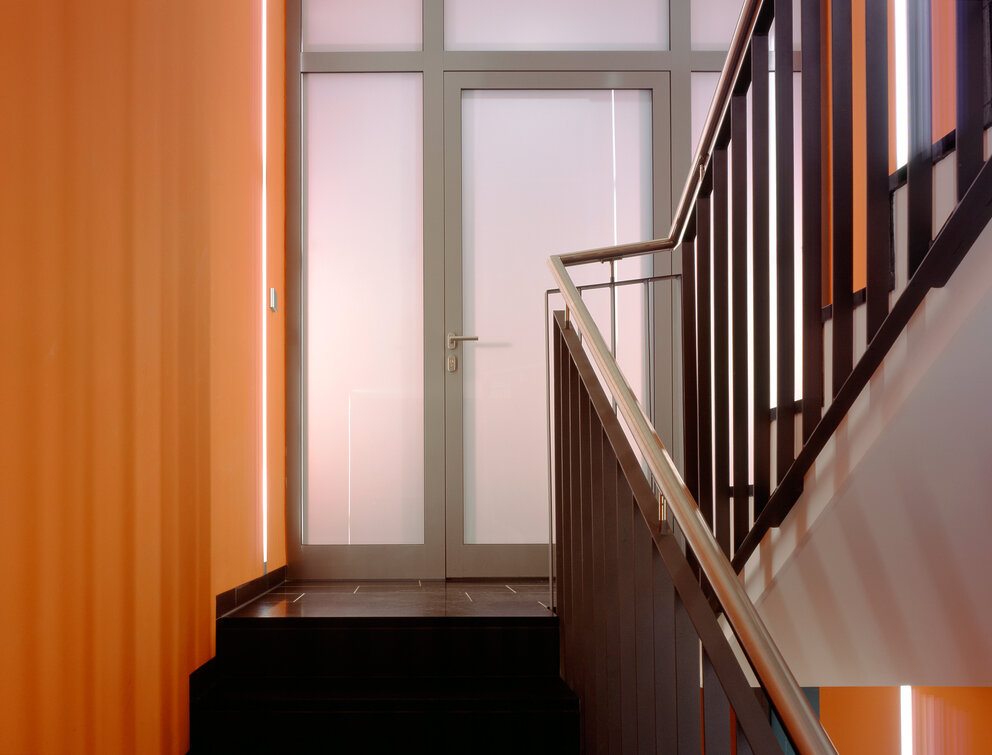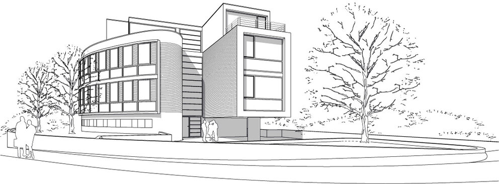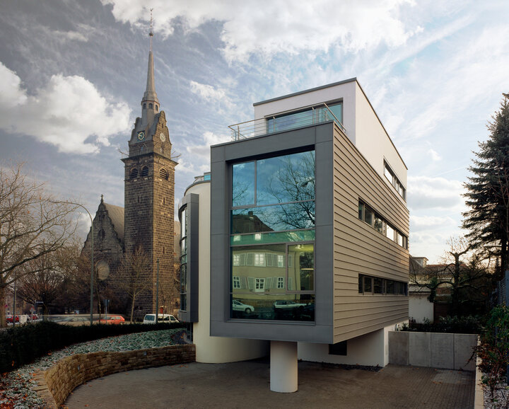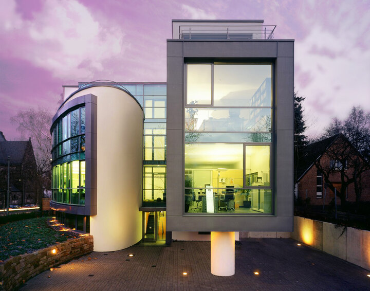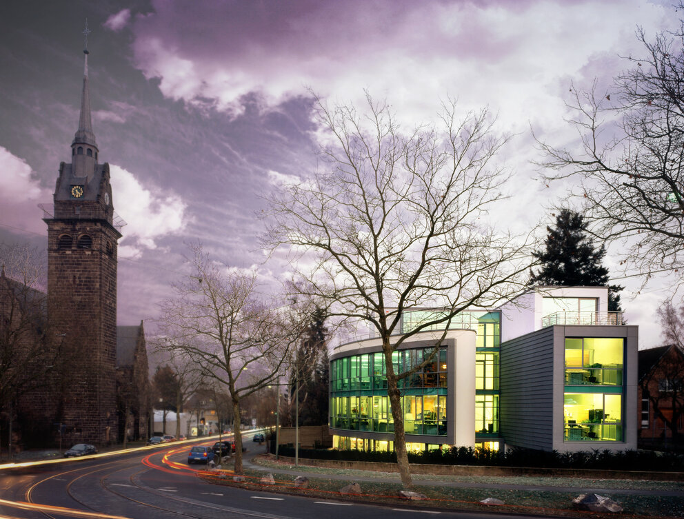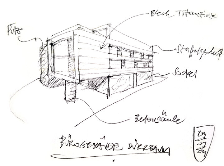 Das Bürogebäude zeigt sich als Ensemble von 2 unterschiedlich formatierten Baukörpern mit der Aufgabe, die historische Fluchtlinie sichtbar zu machen, die Proportionen der denkmalgeschützten Nachbargebäude als Volumen zu zeigen und diese für die städtebauliche bedeutsame Ecksituation modern weiterzuentwickeln. Die Gestaltung der Baukörper trägt dem Material und Farbkontext des Quartiers Rechnung und verdichtet dieses Repertoire zu neuen architektonischen Qualitäten.