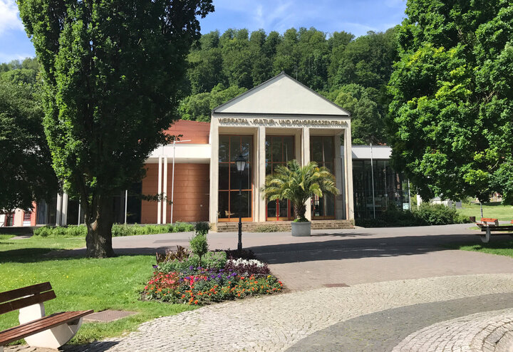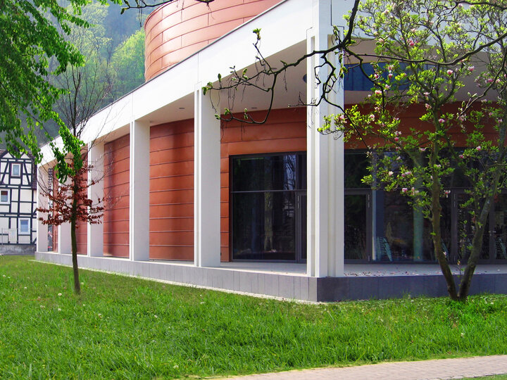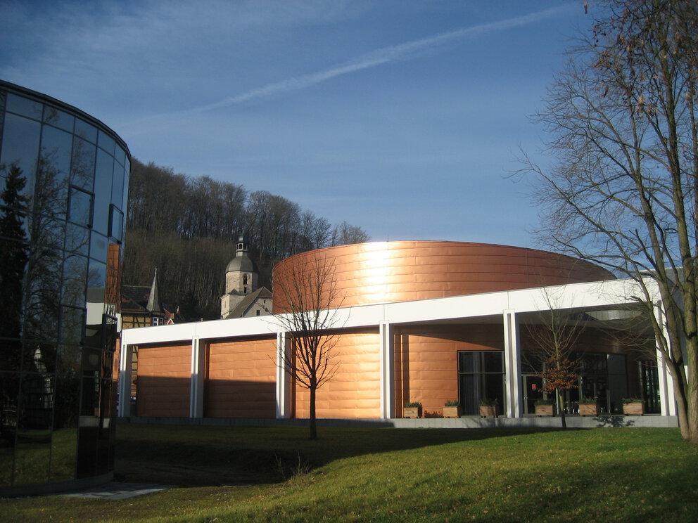 Der Neubau der Halle ersetzt den bestehenden Veranstaltungsflügel im benachbarten Kurhotel, der im Zuge der parallel geplanten Hotelerweiterung durch ein neues Gebäude mit Hotelzimmern ersetzt werden soll.