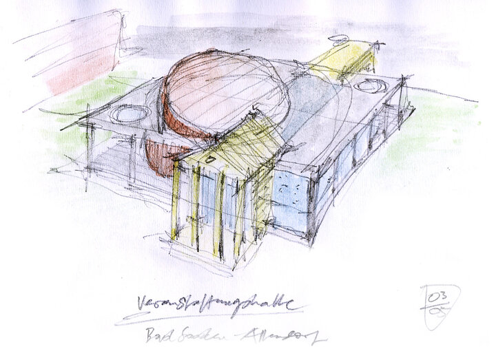 Mit der Salzgewinnung entwickelte sich das ringförmige Siedlungsbild von Sooden, dessen Kern ab 1900 für den Solekurbetrieb umgenutzt wurde - mit dem Bau der Halle beginnt nun die kulturelle Nutzungsphase des Ortes. Der Entwurf präsentiert die Halle in der Form eine großen Pavillons, der in seiner Typologie über die Moderne Bezug nimmt auf die Säulenhalle mit Cella in der Architektur der Antike und in seinem Erscheinungsbild traditionelle Elemente der Bäderarchitektur und Wandelhallen zitiert.