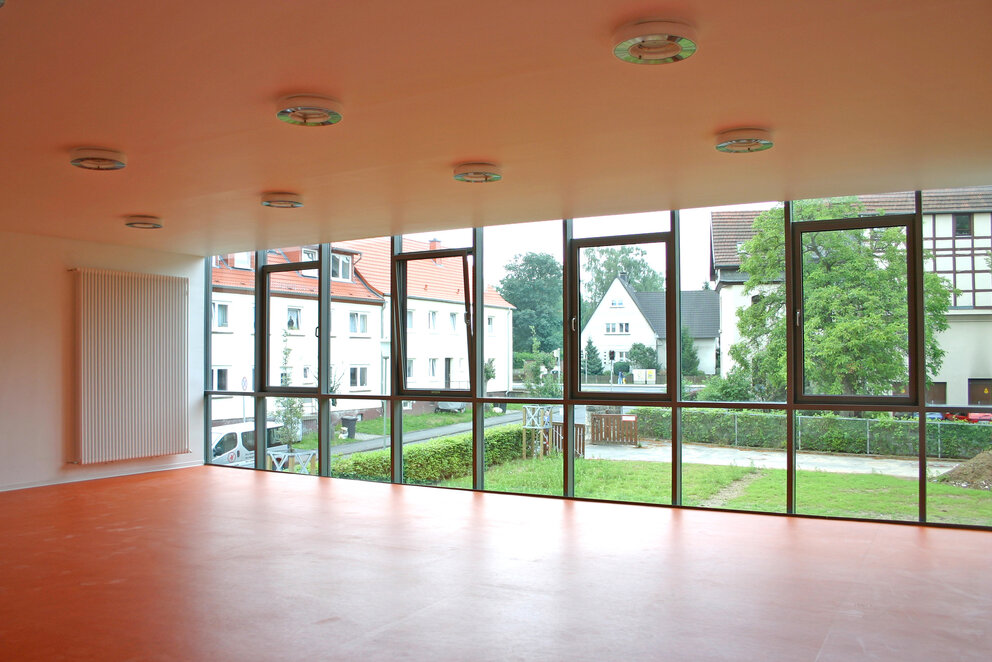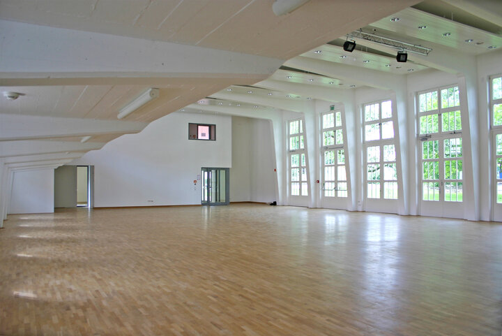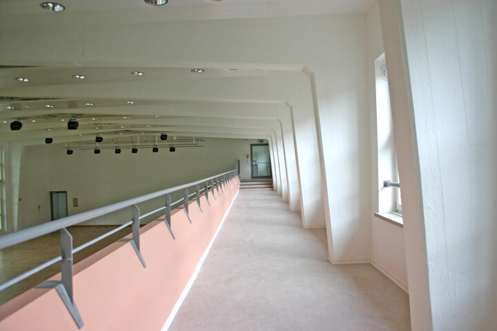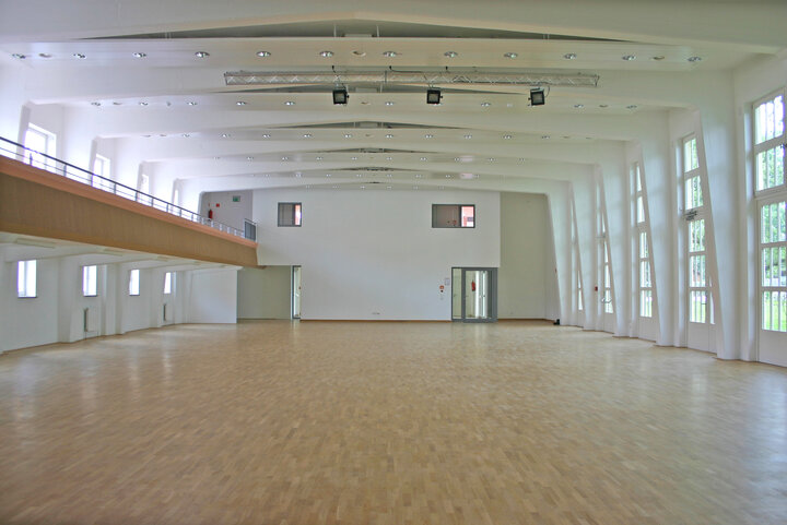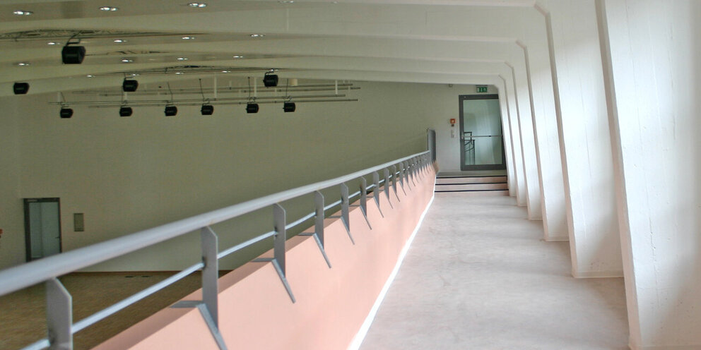 Die Halle mit den raumhohen Fenstertüren zum Schulhof und den prägenden Betonrahmenelementen als Deckenabschluss wird ohne bauliche Eingriffe erhalten und saniert. Die durch die auskragende Empore auf der östlichen Längsseite entstehende Raumteilung wird im Erdgeschoß als Abstellbereich für Geräte und Stühle genutzt und zur Halle mit verschiebbaren Wandelementen abgetrennt.