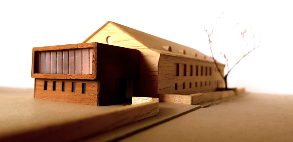 Das Konzept ermöglicht den Erhalt der Turnhalle in ihrer ursprünglichen Raumkonzeption und ihrer schützenswerten Gebäudestruktur. Durch die flächenoptimierende Überarbeitung der bestehenden Nebenräume werden die Funktionen der Raumgruppen verbessert, so dass die ursprüngliche Korrespondenz von Raumfunktion und Fassade erhalten werden kann.