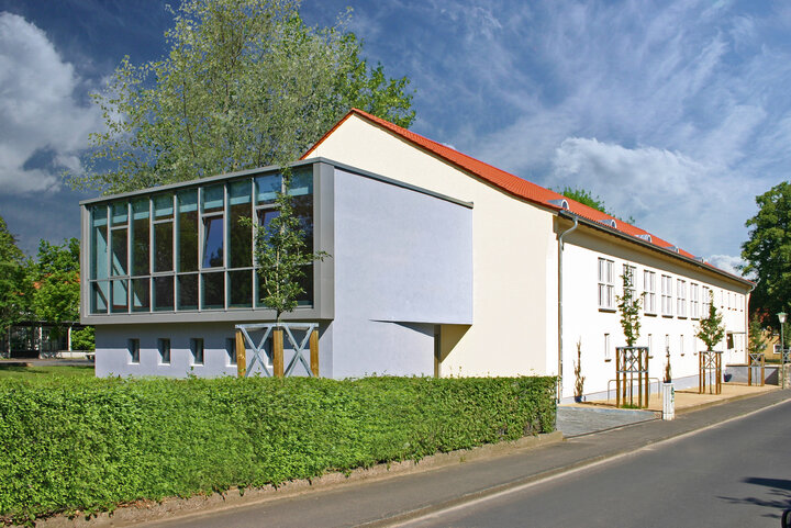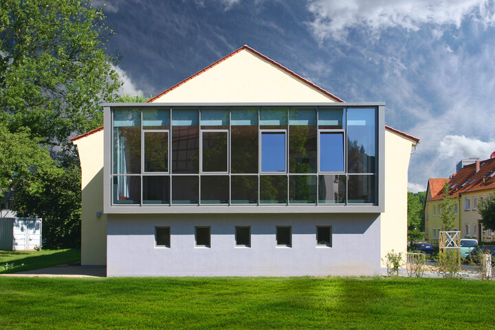 Auf der Südseite wird dem Gebäude ein zweiter massiver Kopfbau angefügt, der sich mit einem Eingangsbereich über die Berlitstraße signifikant zum Quartier öffnet. Im Erdgeschoss dieses neuen Anbaues ergänzen Garderobe, WC´s und Küche mit Theke das Foyer mit Zugang zum Saal. Eine neu angelegte Treppe erschließt vom Foyer einen vielfältig nutzbaren Veranstaltungsraum im Obergeschoss und vervollständigt durch die Anbindung an Empore und Treppe im nördlichen Kopfbau den Erschließungskreislauf im Obergeschoss.