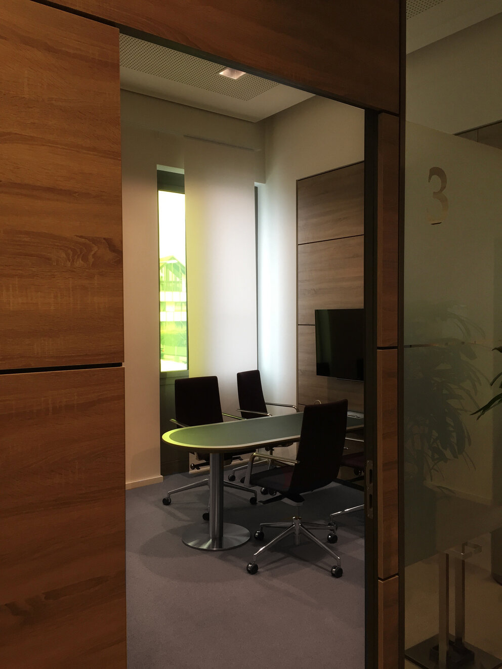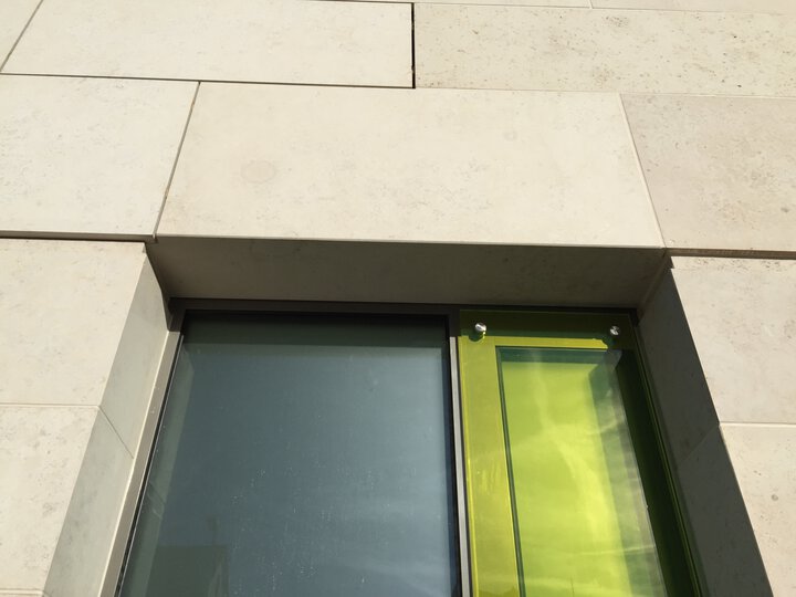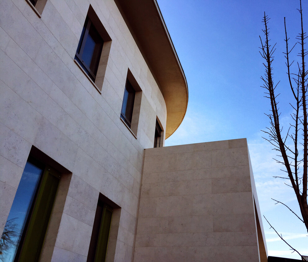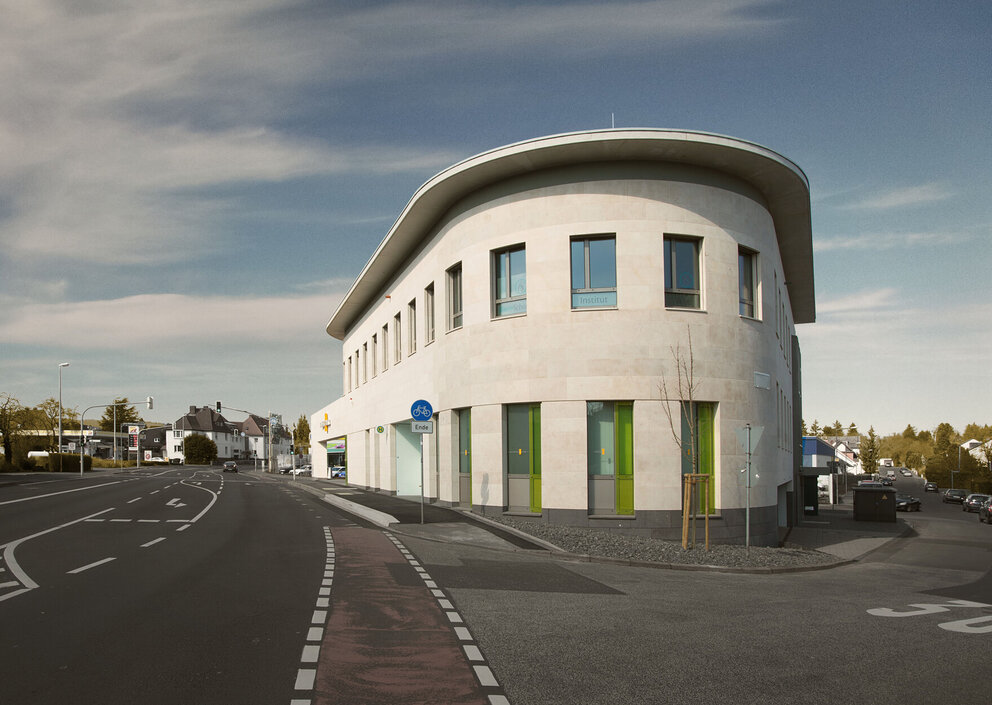Die skulpturale Figur des Gebäudes ergänzt die bestehende Straßen begleitende Bebauung durch Weiterführung der Fluchtlinien, die rhythmische Gliederung der Fassaden unterstützt durch ein umlaufendes bandartiges Fensterthema die architektonische Wirkung des monolithischen ausgebildeten Solitärs.