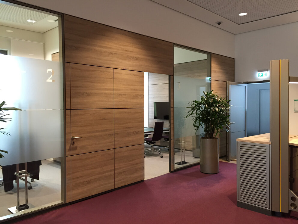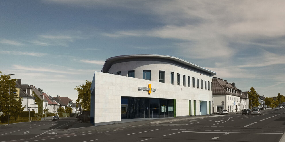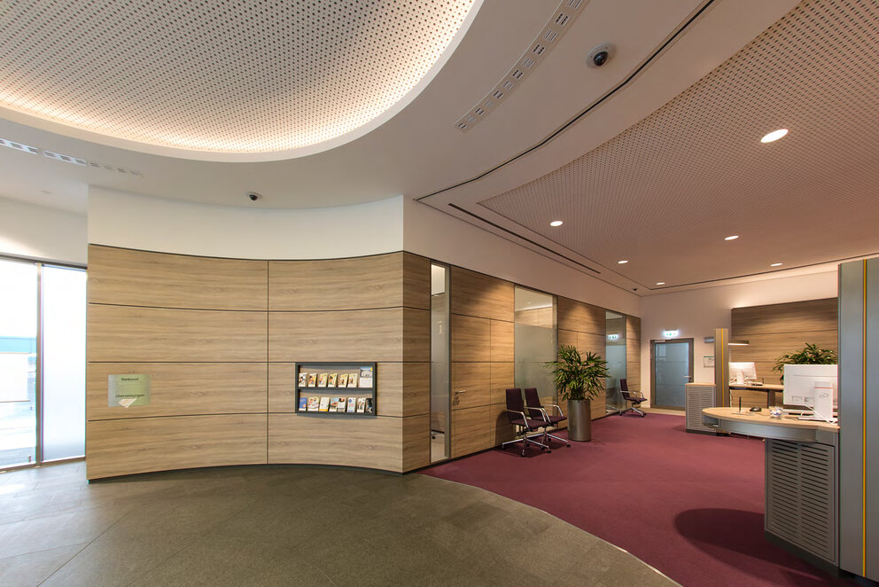 Aus der Figur des Baukörpers entwickelt sich in der westlichen Fluchtlinie die dreiecksförmige Vorhalle als zeichenhafte Öffnung des Gebäudes in den öffentlichen Raum und dient als Eingangsbereich in die Kundenhalle der Bankstelle.